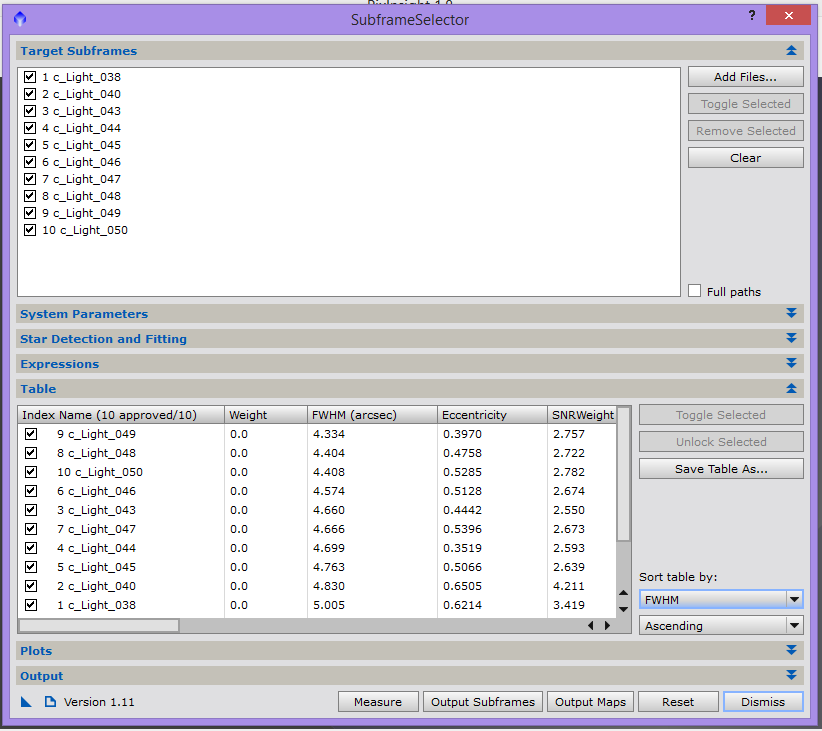 Här har jag laddat upp tio bilder Mät alla bilder. Då skapas det en tabell med olika bildparametrar. Vi är intresserade av FWHM och SNRWeight. Om du inte guidar, behöver du kanske ta med Eccentricity, som anger hur avlånga stjärnorna är i bilden. När det gäller FWHM, är det minsta värdet bäst. SNRWeight ska däremot vara så stor som möjligt. Sortera bilderna enligt FWHM och notera det minsta och det största värdet. Sortera sedan enligt SNRWeight, och notera återigen det minsta och det största värdet.