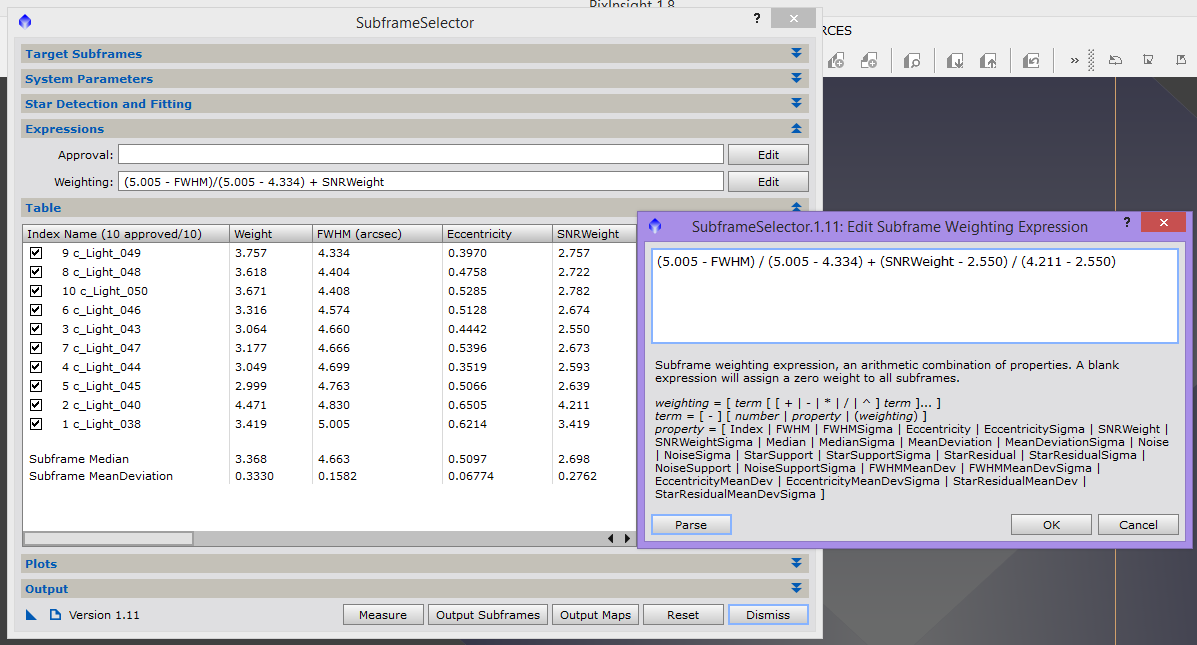 Formeln som Kayron använder är densamma som min, med den enda skillnaden att han multiplicerar med en procentfaktor, så att fwhm eller snr eller eccentricity kan ha mer eller mindre betydelse i den totala viktfaktorn. PixInsight räknar sedan ändå om vikterna vid stackningen så att normaliserat_bildvikt = bildvikt / referens_bildvikt. Det är därför att man bör använda bilden som har störst viktvärde som referens.