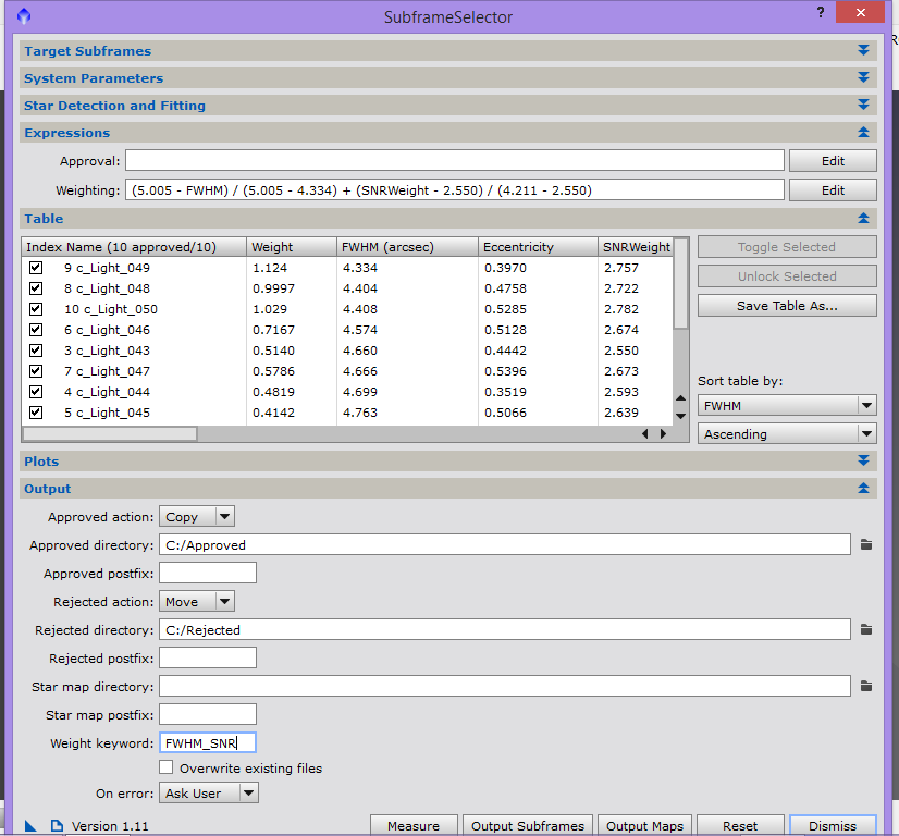 Nu ska dessa värden sparas i varje bild också. Du ska då låta skriptet kopiera (copy, INTE flytta: move) alla subs till en ny katalog. Samtidigt ger du viktfaktorn ett namn. I detta fall blir namnet FWHM_SNR. Fyll i detta under rubriken Output Viktigt: notera också vilken sub som fick störst värde för viktfaktorn. Denna bild kommer att bli referens när du stackar sen. Tryck nu "Output Subframes"