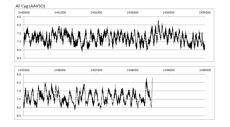 Det är fullt möjligt att AF Cyg för tillfället lyser starkare än den någonsin tidigare gjort sedan upptäckten ... väl valt tillfälle i så fall! Den extrema max-magnituden enligt kataloger är 6.4, det värdet överträffas helt klart.