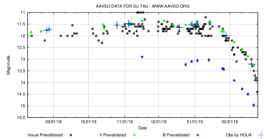 Observationssäsongen för SU Tau har kommit igång och jag fick nyligen data från ett av fjärrteleskopen jag använder (Burke-Gaffney), där stjärnan mättes till V=12.6. Den här märkliga stjärnan har varit aktiv i ganska många år: