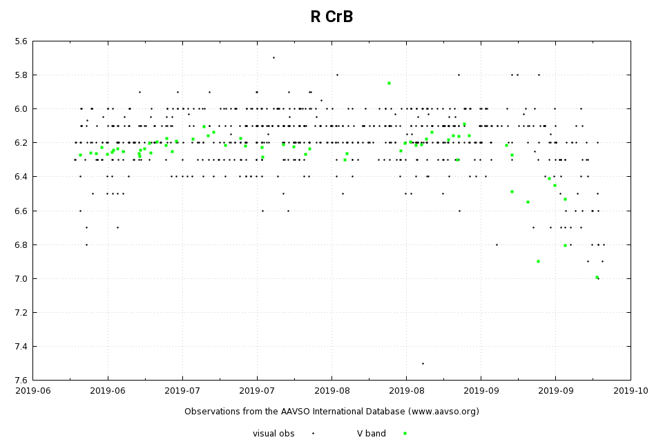 Ta gärna en titt på prototypstjärnan R CrB så snart som möjligt. Det finns några observationer hos AAVSO som tyder på att stjärnan eventuellt kan ha börjat ett "inbrott". I sådant fall kan ljusstyrkan rasa snabbt. Vi vet ännu inte säkert.