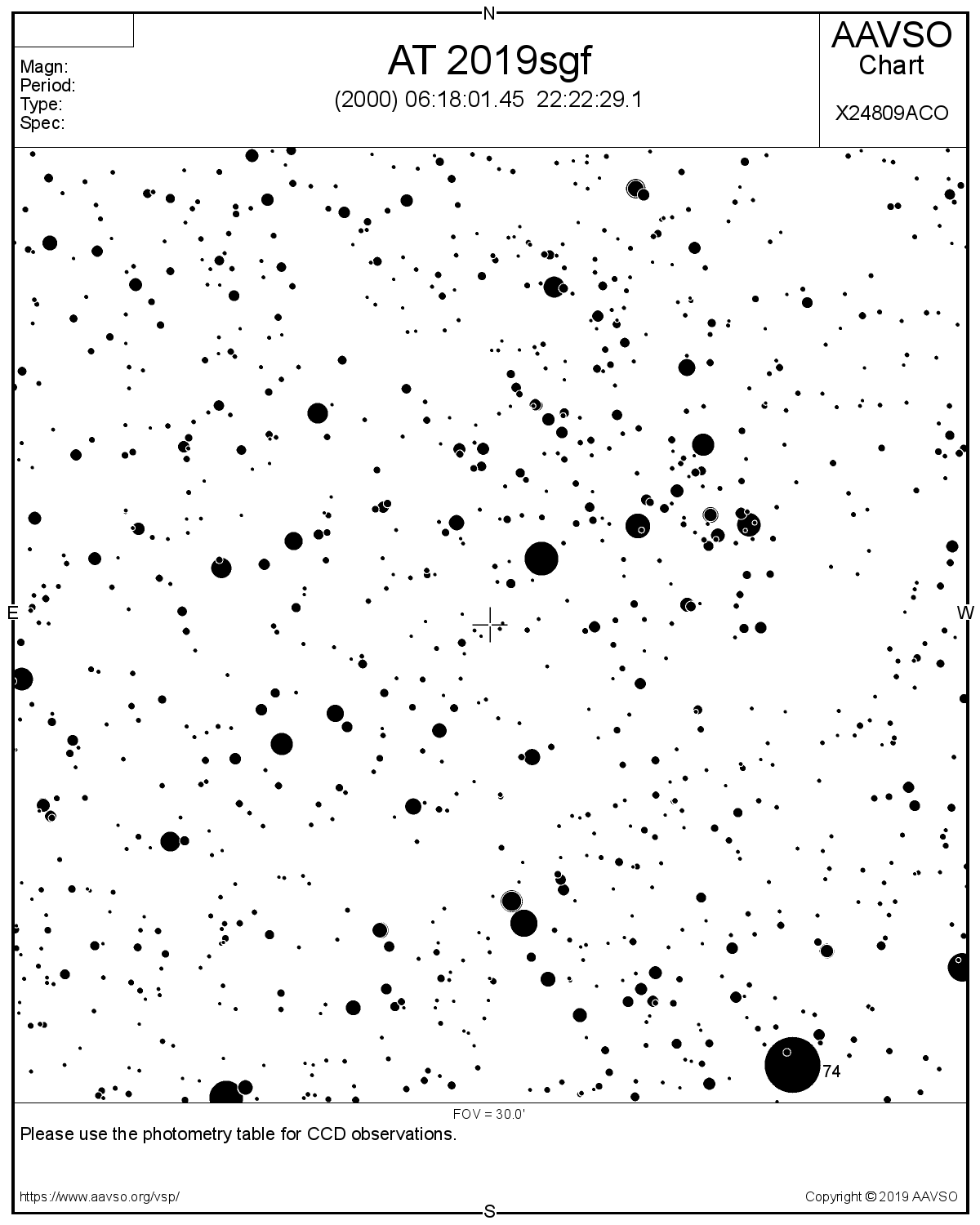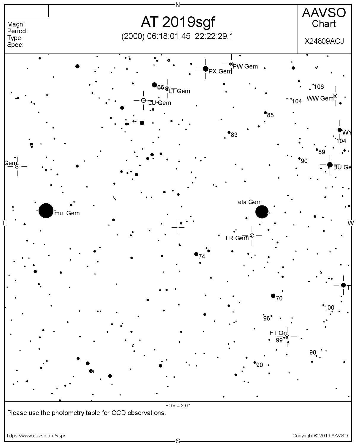 Upptäckten av ett eruptivt objekt i Gemini, med namnet AT 2019sgf, publicerades den gångna natten: