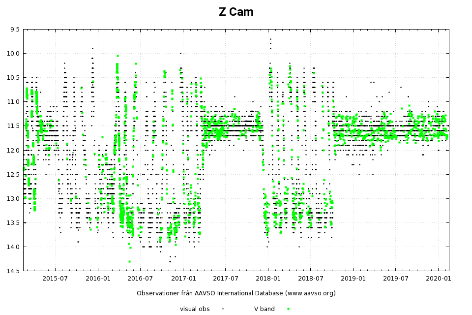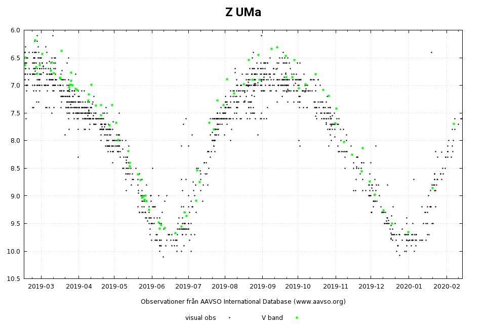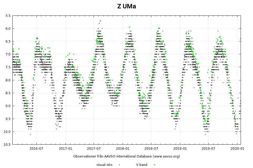 DHEB wrote:Z UMa är åter på väg upp efter ett till relativt djupt minimum. Det verkar som trenden de senaste cyklerna är att stjärnan beter sig mer och mer lik en Mira.