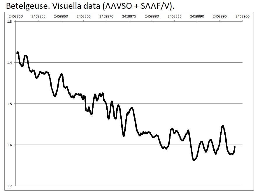 Har avtagandet i ljusstyrka hos Betelgeuse avstannat? Ja, åtminstone tillfälligt. Kurvan nedan visar stjärnans beteende i visuellt ljus sedan nyår, och bygger på data från AAVSO och vår egen variabelsektion SAAF/V.