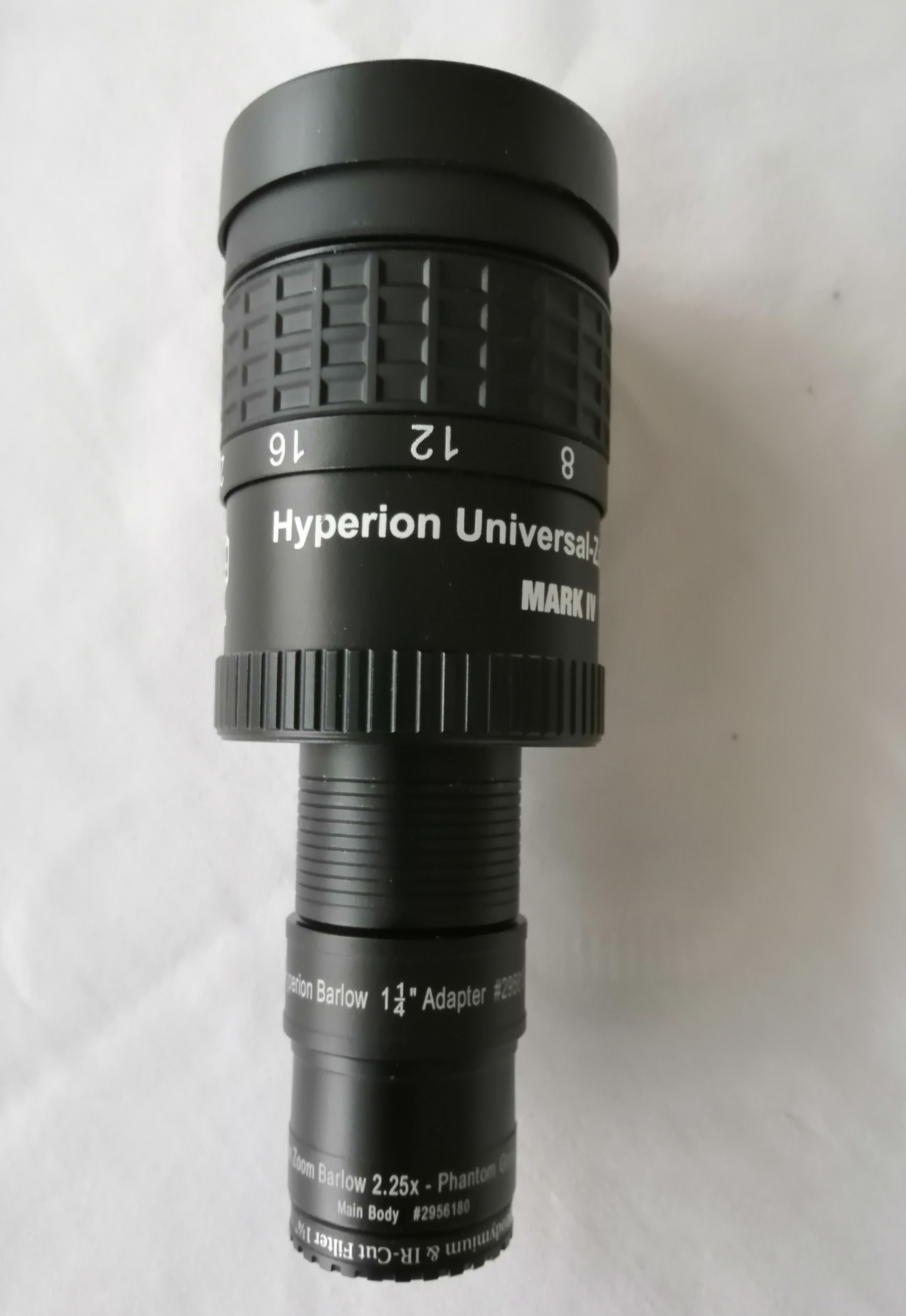 Jag har skaffat en Baader Hyperion zoom med tillhörande 2,25x barlow (i paket, samma tillverkare) och det blir lite märkligt på mitt teleskop (SkyWatcher 250 Flextube).