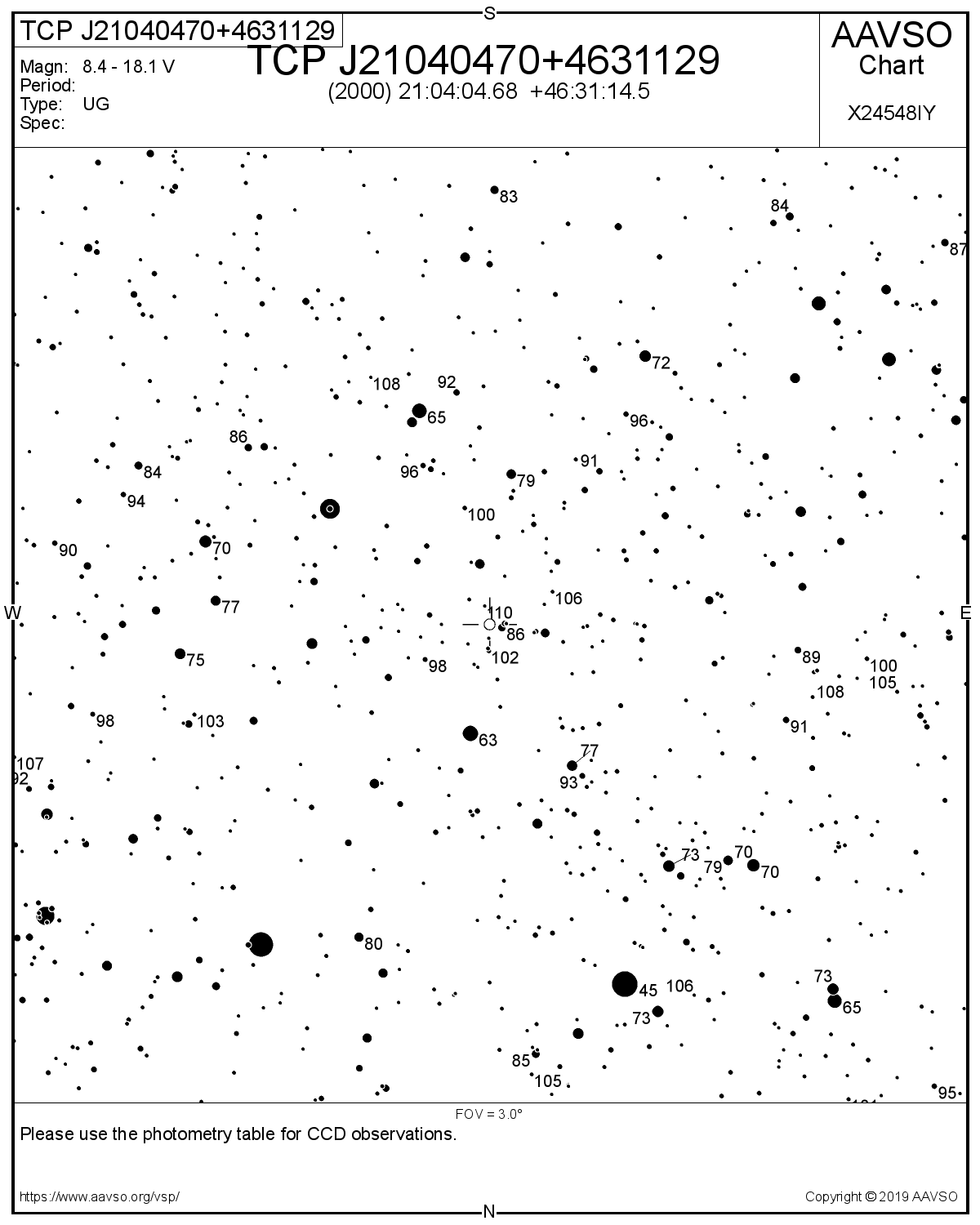 Den här ovanligt ljusa och tidigare okända dvärgnovan går fortfarande att fånga med mindre teleskop, jag obsade den till 10.3 alldeles nyss. Observationer registreras i SVO under namnet TCPJ21040470+4631129.