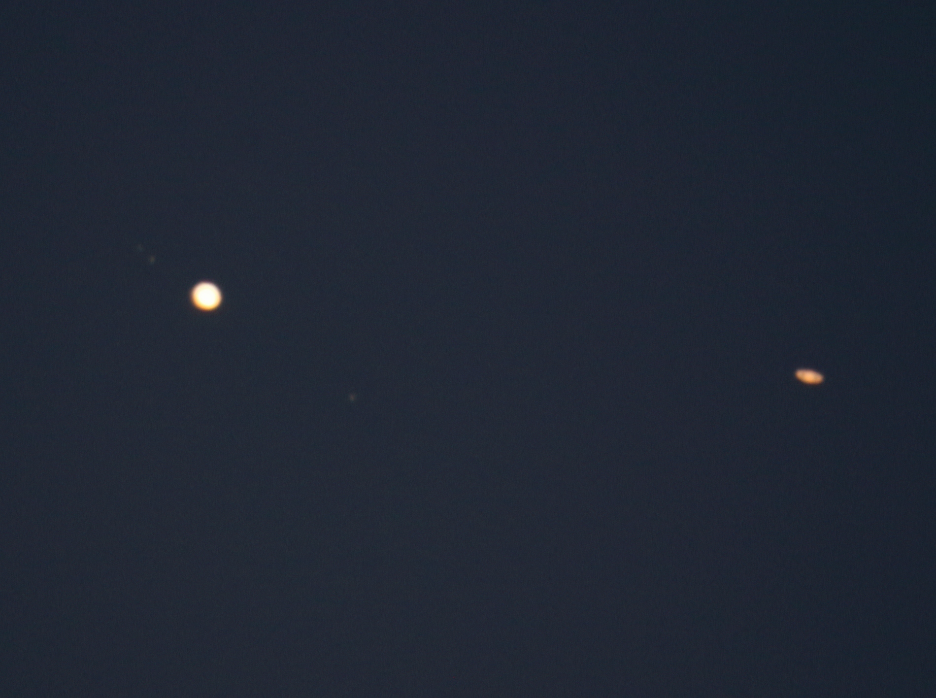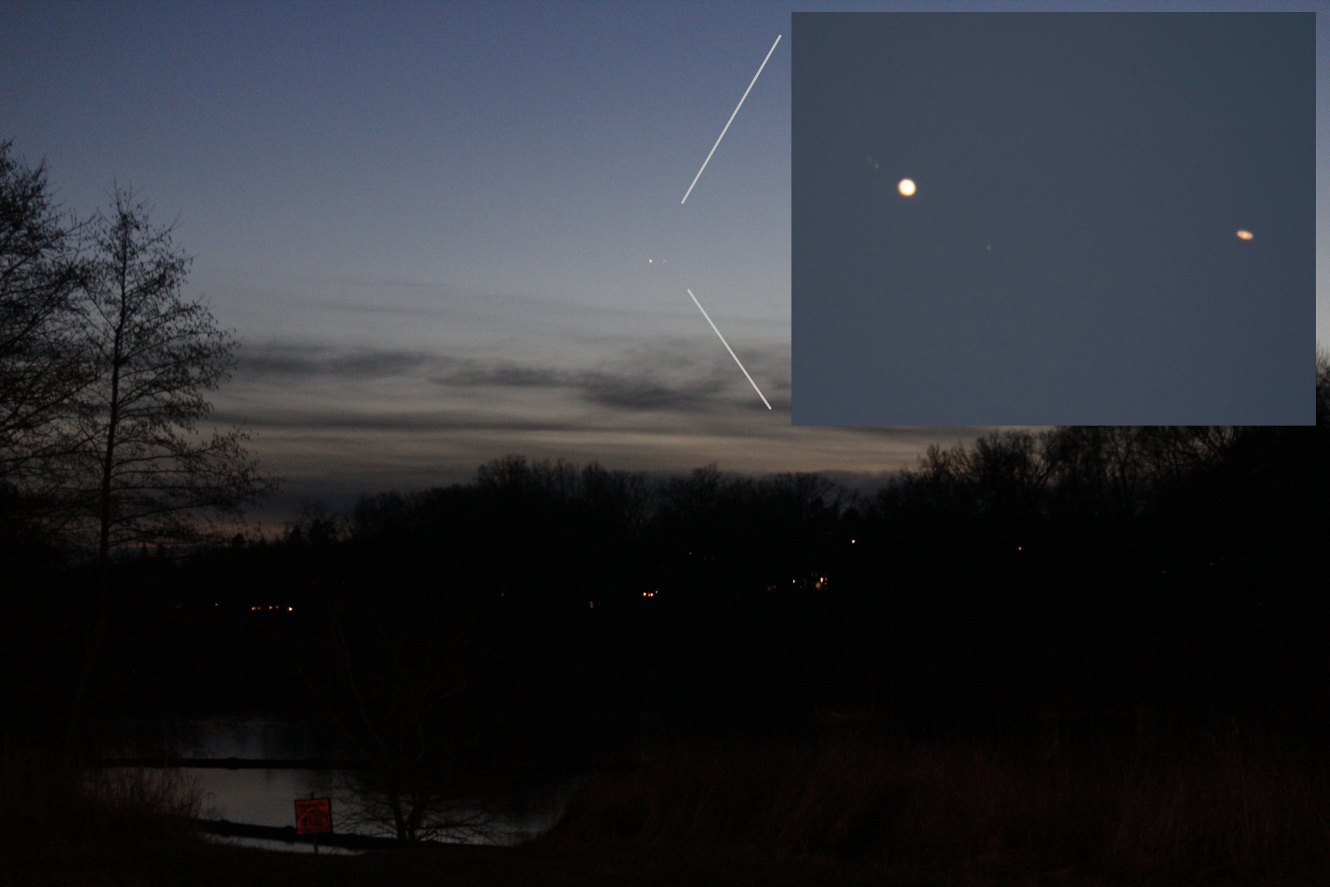 Kommentar: Äntligen en skymt av blå himmel. Jupiter-Saturnus konjuktionen lågt vid horisonten och lite drivande moln. 2 bilder sammanvägda och justerade i GIMP, Registax m.m.