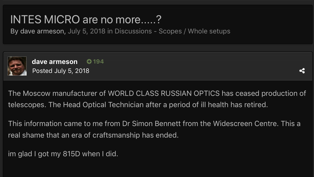 Det är väl troligt att en del ryska amatörteleskop fortfarande tillverkas, jag låter det vara osagt. Men sett i det stora internationella sammanhanget är andelen ryska teleskop mycket begränsad.
