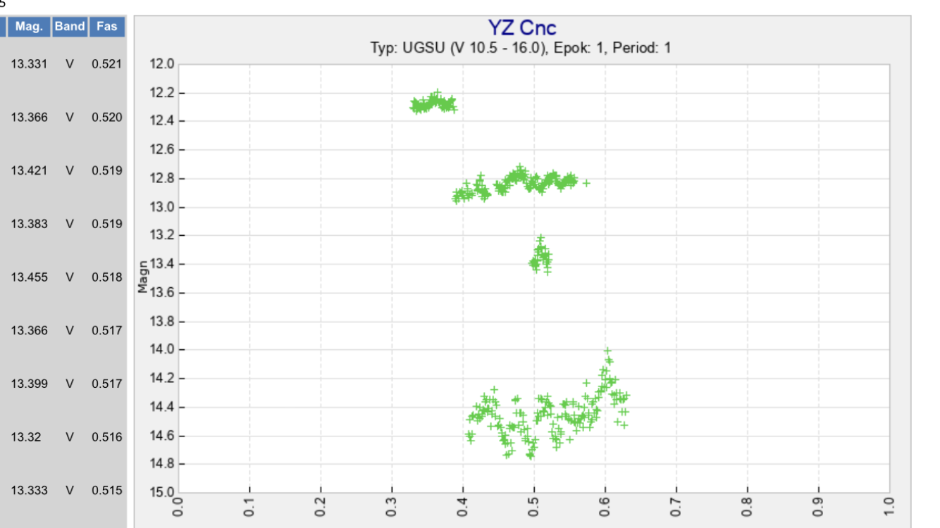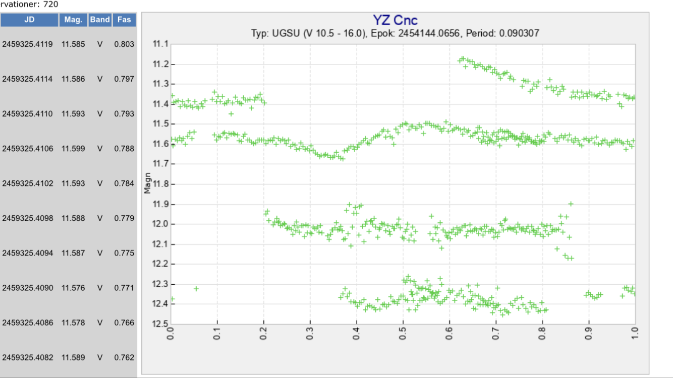Magnus Larsson har under de senaste månaderna producerat nio tidsserier av YZ Cnc. Dessa ses i den övre översiktliga bilden nedan.