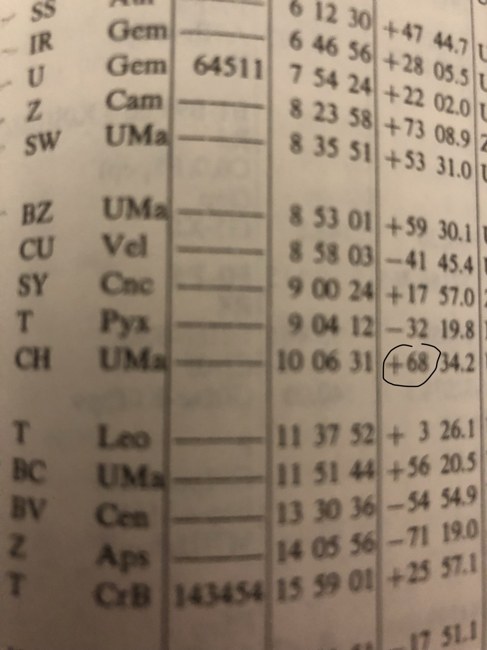 Men i 1987 års upplaga såg jag, mest av en händelse, att CH UMa hade placerats ungefär en grad för långt norrut! Felet upprepades året därefter, varvid jag skrev ett brev till Her Majesty’s Nautical Almanac Office och påpekade saken. Huruvida bot och bättring blev resultatet kollade jag faktiskt aldrig upp ...