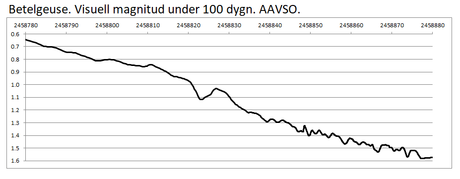 Betelgeuse har ännu inte börjat ljusna. Diagrammet nedan visar den visuella magnituden under 100 dygn, 23 oktober 2019 - 31 januari 2020.