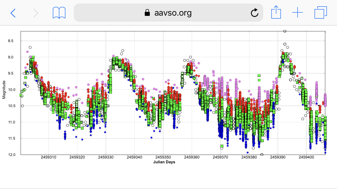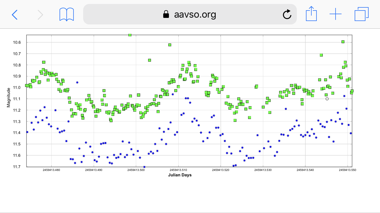 Nedan ges Magnus BVI-mätningar den gångna natten (10-11 juli) samt en längre AAVSO-kurva.