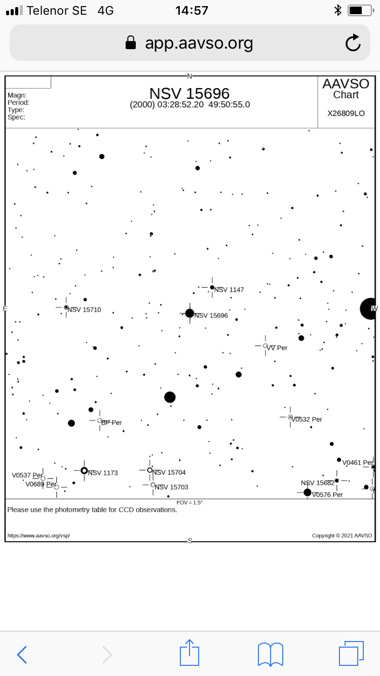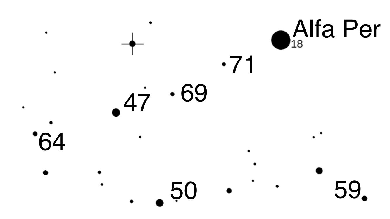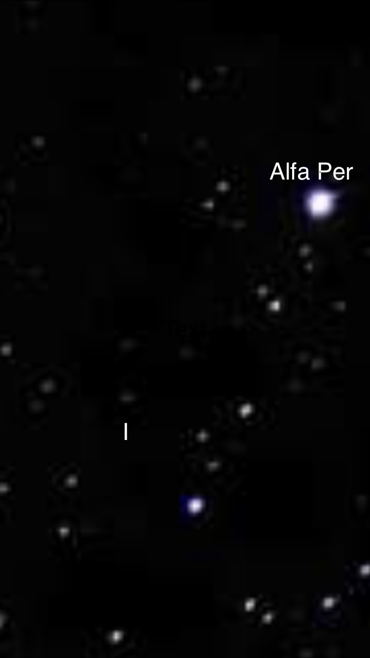 Så snart jag får klartecken från Andreas att låna en bit av hans bild så lägger jag den här nedan. Tills vidare ger jag AAVSO-kartor med och utan foto. Norr uppåt, utsnitt 1.5 grader. Den mycket ljusa stjärnan i högerkanten är Alfa Persei.