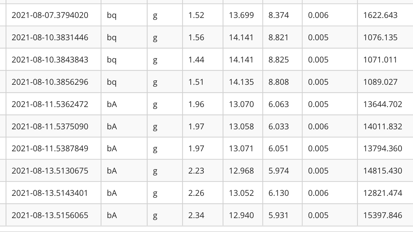 Nu har jag tittat närmare på ASAS-SN-data. Där ger en kamera stabila g-magnituder kring 6.0 (även 11 augusti) medan en annan kamera ger g-magnituder mellan 8 och 9. I det senare kamerafallet handlar det nog om att stjärnan är för ljus för pålitliga mätningar. Se tredje sifferkolumnen i skärmklippet från ASAS-SN nedan. Blandningen av olika kamerors resultat kan vara orsaken till den stora amplitud som ges i katalogen från Jayasinghe et al.