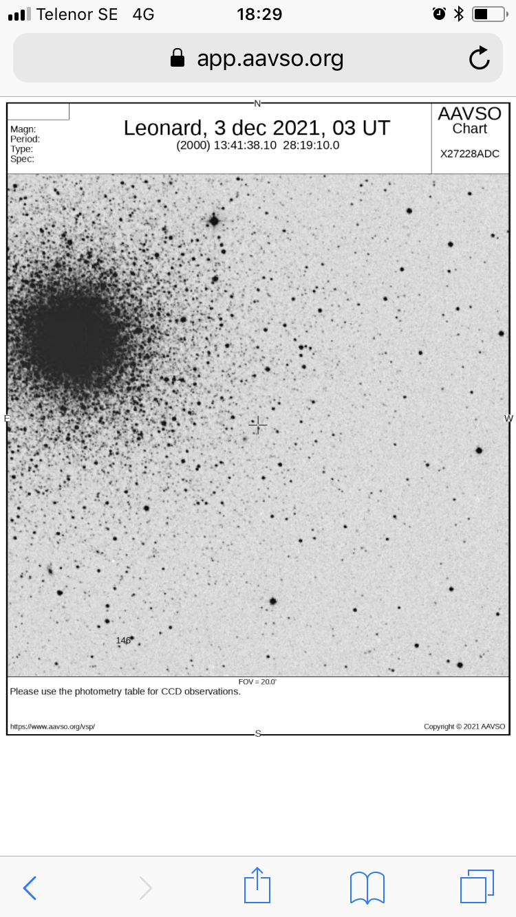 Ja, jag försökte se Leonard redan i början av september men den befann sig då lågt rakt i norr, vilket är min sämsta riktning med tanke på gatlysen och Uponor-fabriken. Kometen skulle vara av ca 14 mag men såg inte ett spår av den med 12 tums Dobson. I oktober var det några mån- och förhoppningsvis molnfria morgnar som jag försökte se komet Leonard. Den skulle vara då ganska högt upp i nordost men jag ser inte åt det hållet från min ordinarie observationsplats. Jag bar därför ut teleskopet till en plats på gården med fri sikt redan på kvällen och skulle försöka obsa Leonard tidigt på morgonen. Trots att prognosen såg lovande ut hade moln hunnit dra in vid båda tillfällena. Det var liknande prognos nu i morse men denna gång hade jag turen med mig. Jag blev lite förvånad hur enkelt C/2021A1 (Leonard) syntes med kikarna. Om prognosen håller i sig bör kometen börja synas med blotta ögat första eller andra veckan i december.