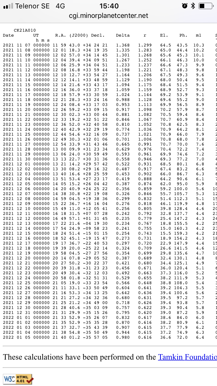 Efter ett antal molniga morgnar i oktober-november fick jag då min första titt av komet C/2021 A1 (Leonard). Imorse klockan 4:07 UT kunde jag se Leonard med 18x50-kikare. Skattad magnitud 9.5, komadiameter 5' och DC=4/. Med 25x100-kikare såg jag en stellär pseudonucleus av 11-12 magnituden. Då jag råkade få en kraftig nackspärr vid uppvaknandet imorse (!) så var det lite smärtsamt att obsa komet Leonard på 46° höjd med böjd nacke!