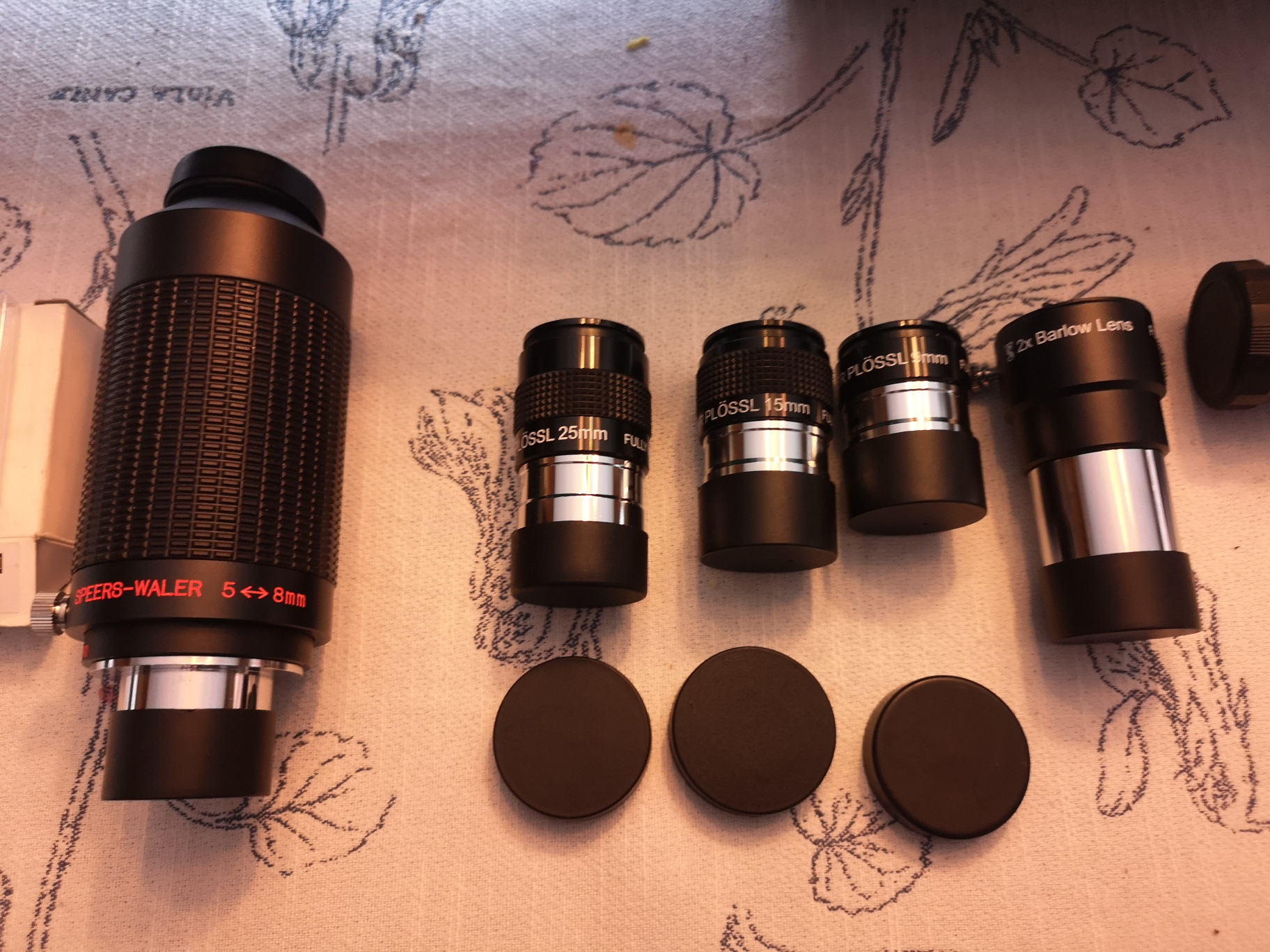 Okular: Super plössel 25mm, 15mm, 9mm; Antares Speers-Water 5-8mm (ca 80 grader synfält), 2x barlow lins
