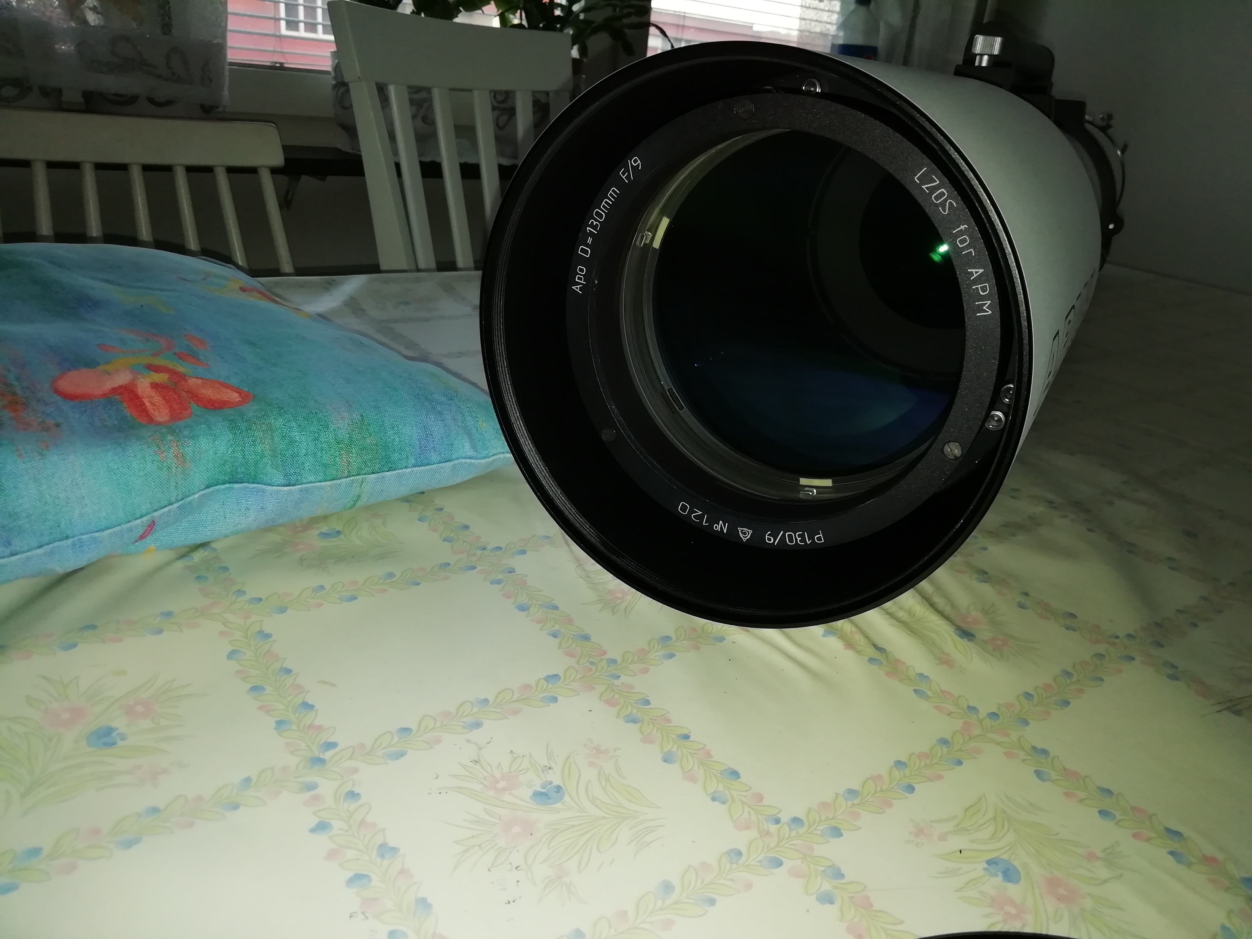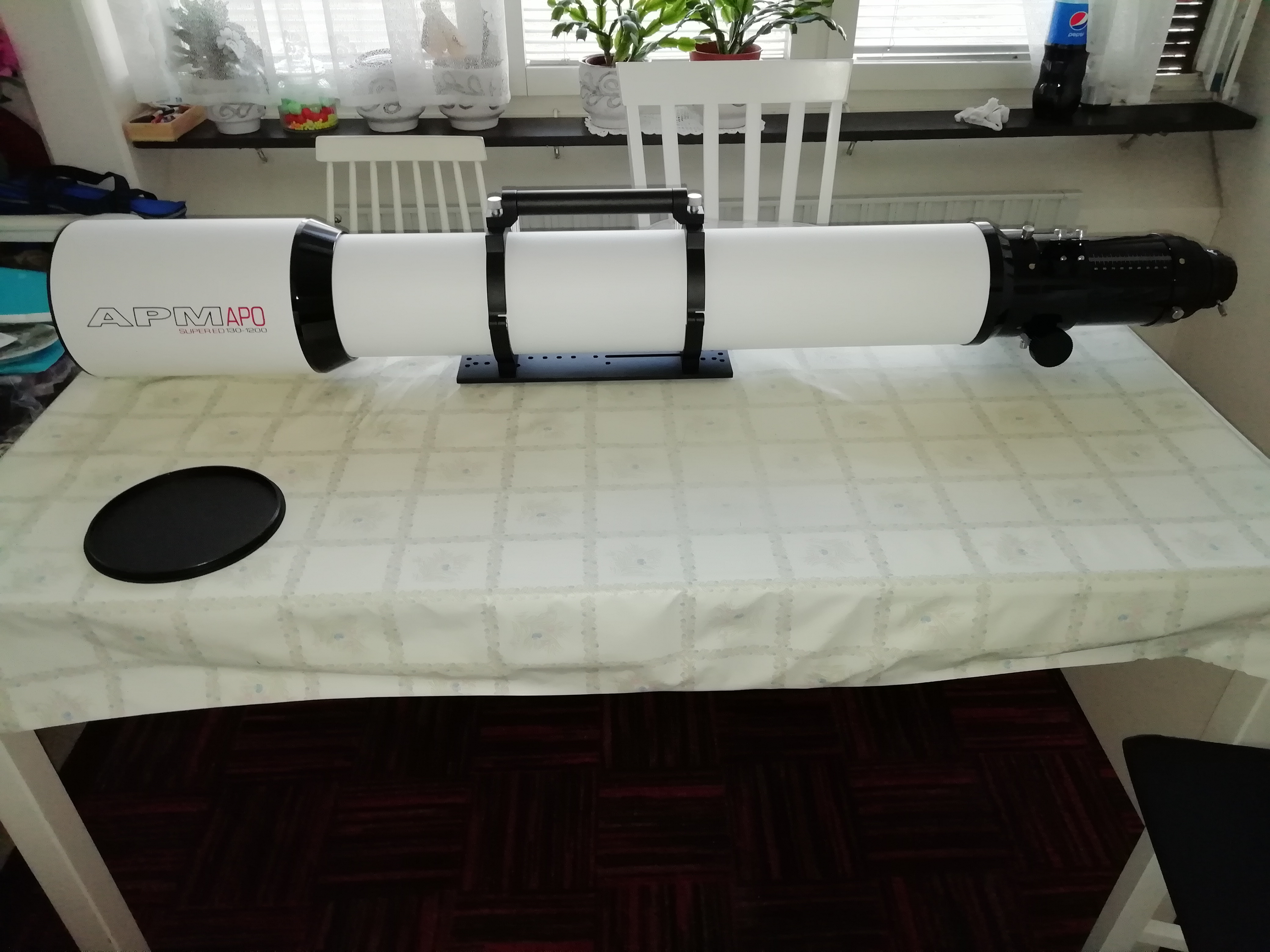 Nyskick, endast använd 4-5 ggr. Som mitt visningsnamn antyder så observerar jag mestadels från balkongen. Storleken underskattades och tyvärr är det överdimensionerat för min utrymmesbegränsade balkong. Optiken är den bästa jag observerat igenom, vid ett tillfälle när väderförhållandena var som bäst kunde månen observeras med 500x utan att bilden bröts ner. Teleskopet är diffraktionsbegränsat med en Strehl-garanti på 95%. Optiken är för hand bearbetad av LZOS på uppdrag av APM. 6 månaders garanti medgår från Tecknosky, ca.3 månader kvar.
