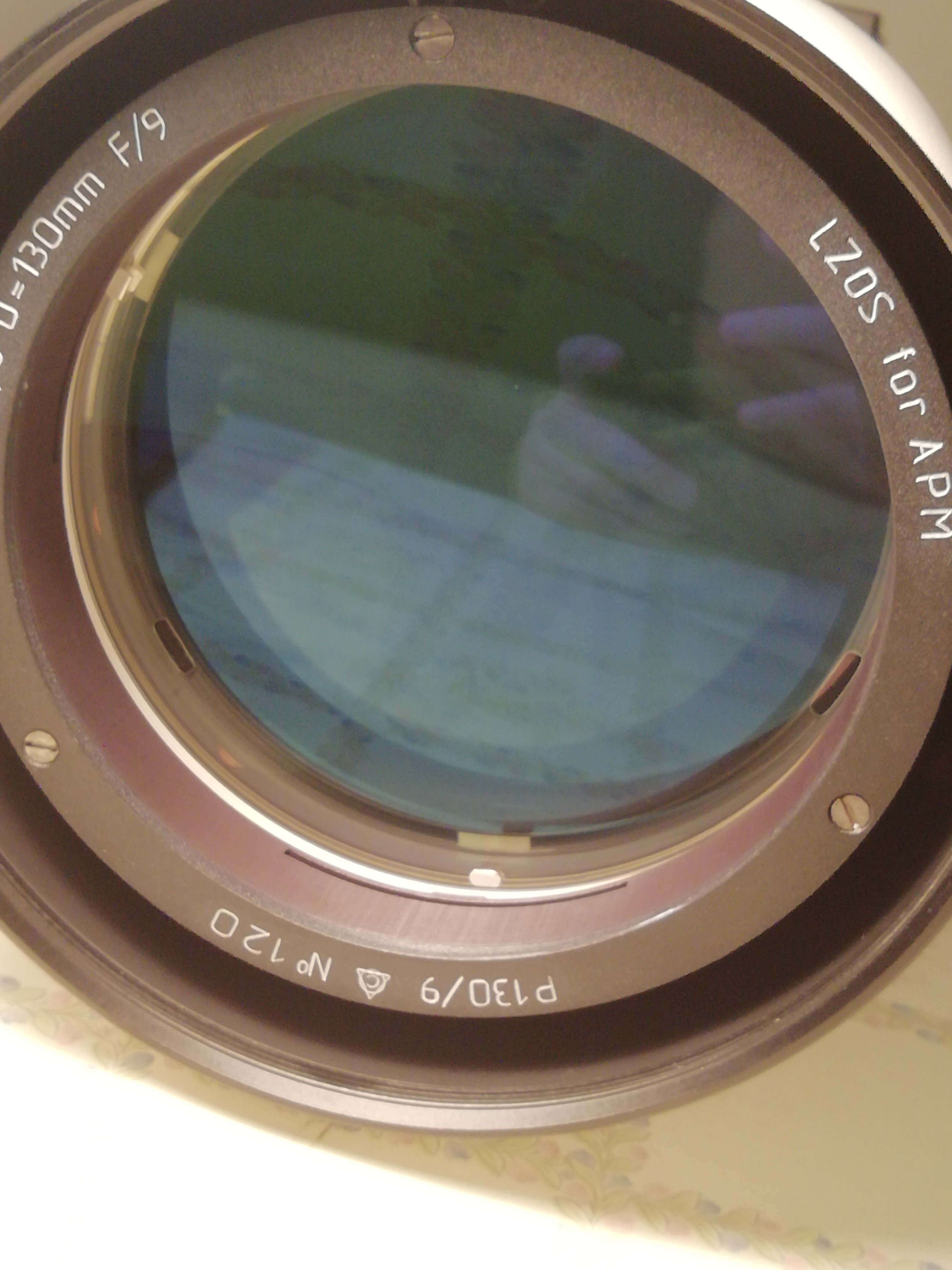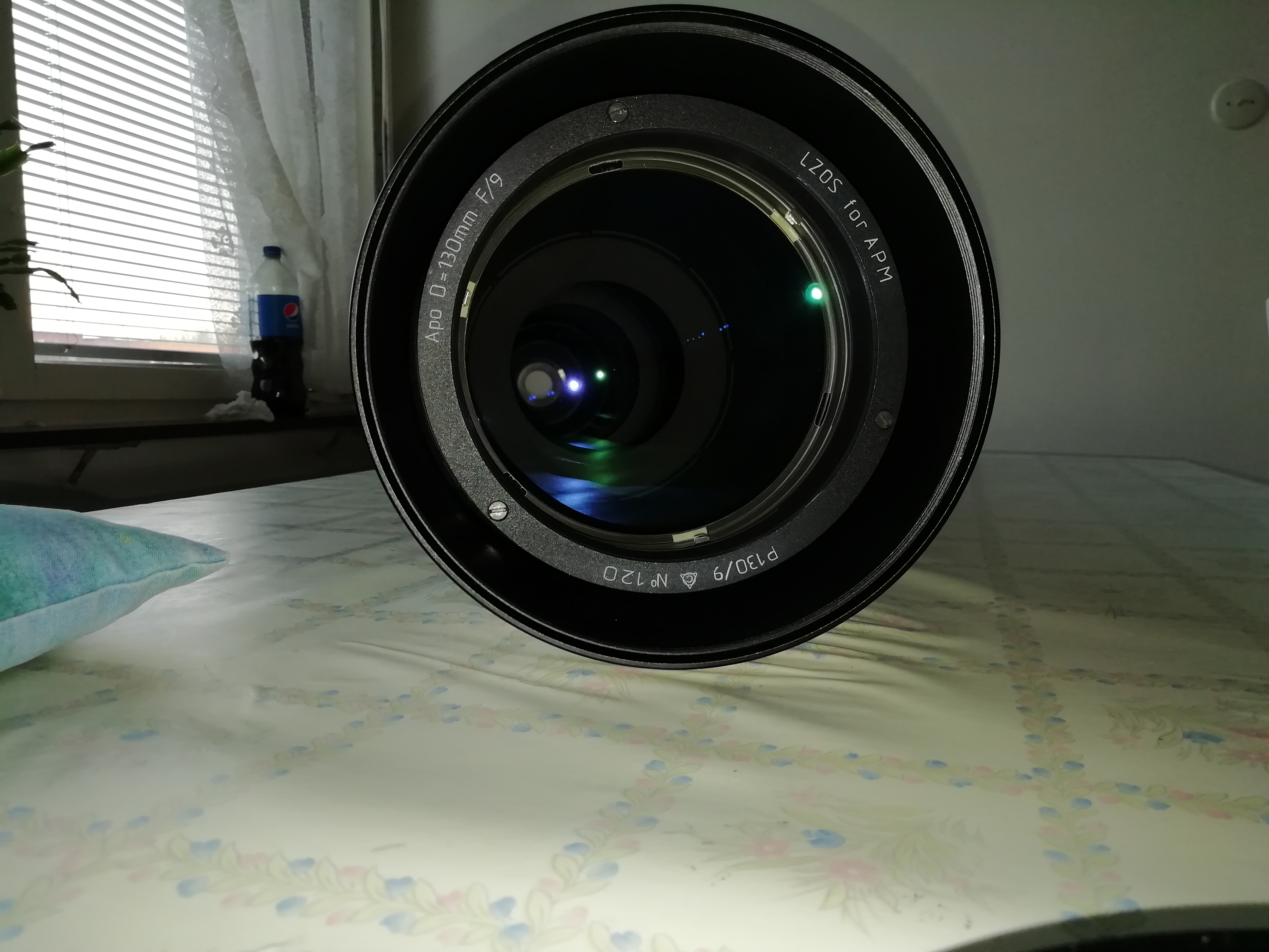 Det finns en liten smuts fläck på en av de inre linserna, vilket den nedre bilden visar. Jag är väldigt petig med sådant så jag vände mig till APM, Markus Ludes svarade personligen och vi hade en korrespondens, de kan tvätta bort den men ansåg det onödigt, han visade även större LZOS linser med värre "skönhets deffekter", budskapet var att vackra linser att se på fanns att köpa maskinpolerade från fjärran östern medan vackra linser att se genom behöver handfigurerars av skickliga mästare för hand. Vid intresse kan jag bifoga mailen.