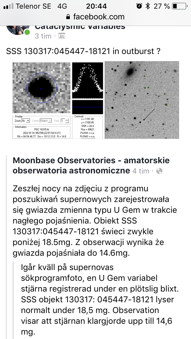 Gregor har upptäckt ett dvärgnovautbrott på en av sina bilder. Jag tar mig friheten att klistra in ett skärmklipp från Facebook. Översättningen till svenska är gjord av översättarmaskin.