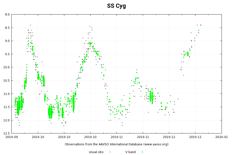 Jag vet inte vad som gäller kring senaste 3 månaderna, men i övrigt är kataklysmiska stjärnor tätt dubbelstjärnor där den ena stjärna överför material till den andra, tills en kritisk gräns nås och ett utbrott börjar. I AAVSO:s webbsida för SS Cygni anges flera referenser till vetenskapliga artiklar som kan vara intressanta.