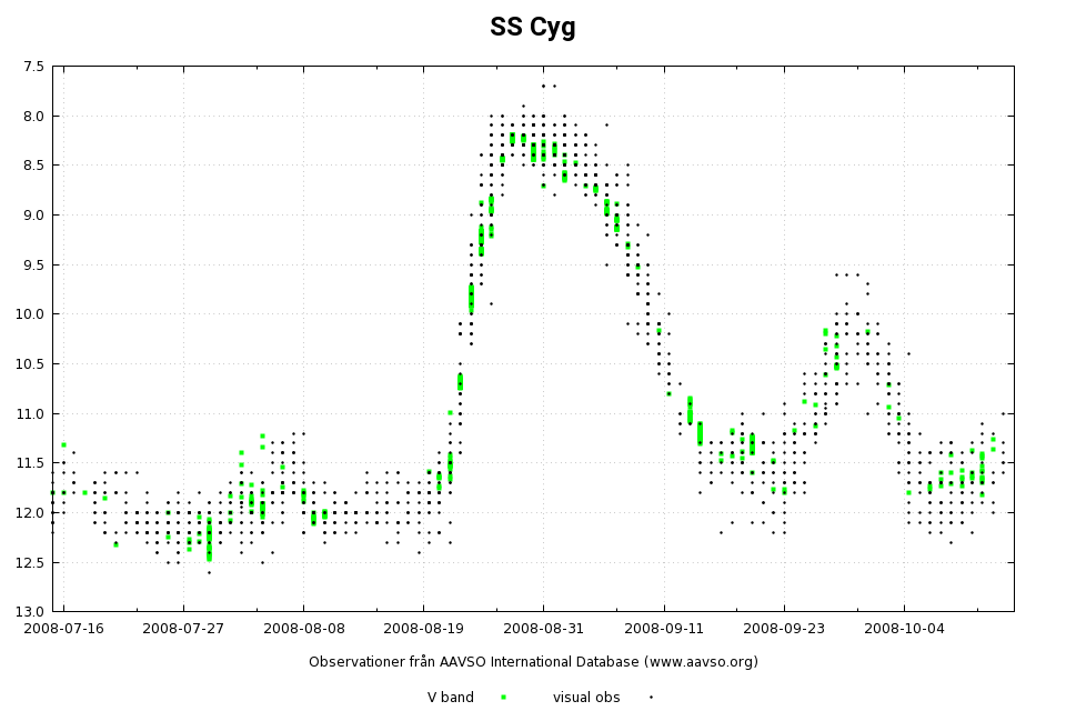 Spännande med SS Cyg! Jag mätte den till 8,767 igår (v-filter och CCD). Finns det nån teori eller hypotes om vad som ligger bakom den här lustiga kurvan?