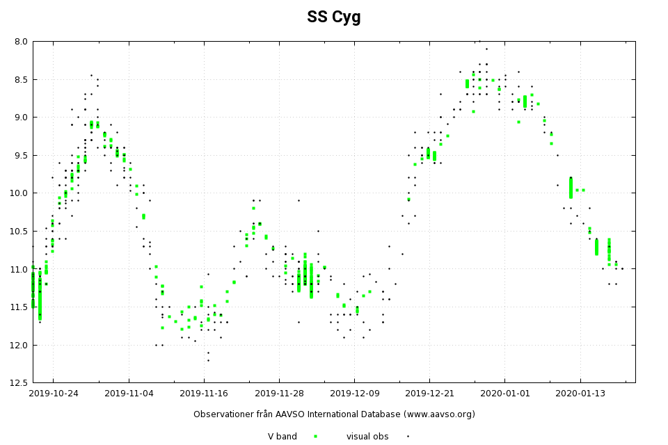 Redan omkring den 16 december 2019 passerade SS Cyg visuell magnitud 11.0 på uppåtgående. Inte förrän nu (21 januari 2020) passeras denna magnitud på nedåtgående! Har stjärnan någonsin under dess kända historia varit så ljus under så lång tid? Jag vet inte, det tar tid att kolla, men man kan konstatera att detta utbrott har varit alldeles osedvanligt utdraget.