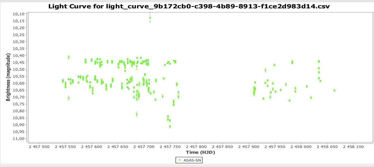 Stjärnan heter TYC 4623-157-1 och ingår i Gaia DR1. Två mätningar finns i APASS Epoch Photometry Database, den ena på V= 10.4692, den andra på 10.412. Eftersom APASS Epoch-observationerna gjordes med ett teleskop och inte med ett kameraobjektiv är bildskalan bättre än ASAS-SN:2.57 bågsekunder istället för 8. Två mätningar som bägge två ligger på den övre nivån.