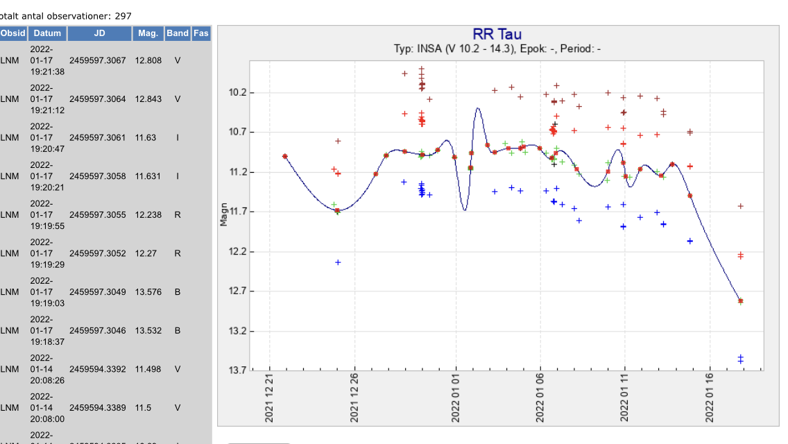 Finns det någon möjlighet att få till någon obs av RR Tau även ikväll (22 jan) eller i natt eller tidigt i morgon bitti? Helst bör i så fall obsen komma in till SVO senast i morgon em, så att den kan ligga till grund för beslut på NOT vad gäller i morgon kväll.