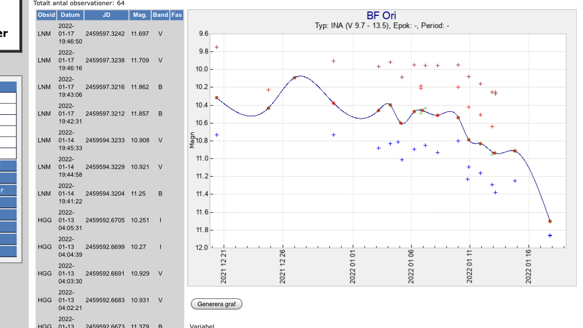 Den senaste utvecklingen av BF Ori syns nedan. Otroligt fin kontinuitet i sektionens mätningar. Levereras 1-2 gånger dagligen till NOT-teamet.