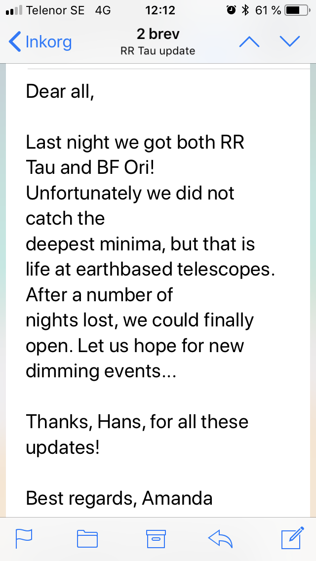 Tyvärr, mulet idag här.Hans Bengtsson wrote:Finns det någon möjlighet att få till någon obs av RR Tau även ikväll (22 jan) eller i natt eller tidigt i morgon bitti? Helst bör i så fall obsen komma in till SVO senast i morgon em, så att den kan ligga till grund för beslut på NOT vad gäller i morgon kväll.