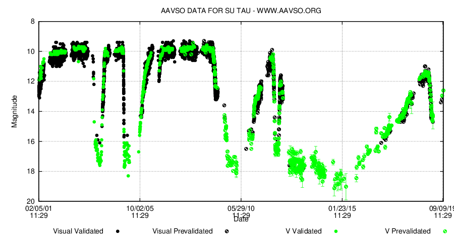 Observationssäsongen för SU Tau har kommit igång och jag fick nyligen data från ett av fjärrteleskopen jag använder (Burke-Gaffney), där stjärnan mättes till V=12.6. Den här märkliga stjärnan har varit aktiv i ganska många år: