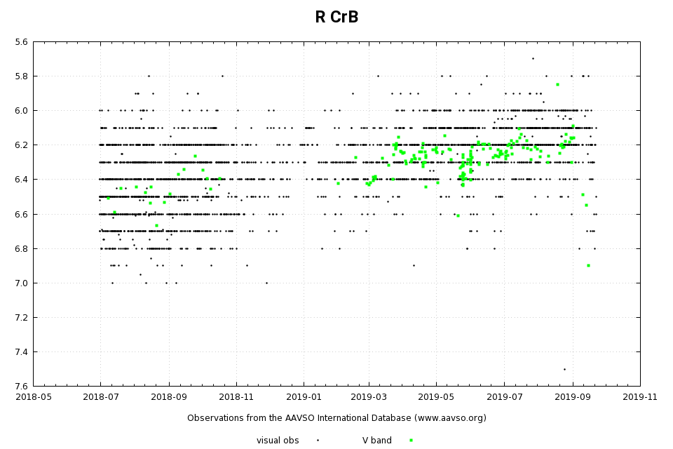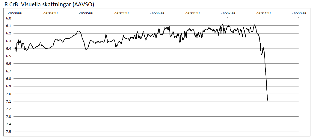 Ta gärna en titt på prototypstjärnan R CrB så snart som möjligt. Det finns några observationer hos AAVSO som tyder på att stjärnan eventuellt kan ha börjat ett "inbrott". I sådant fall kan ljusstyrkan rasa snabbt. Vi vet ännu inte säkert.
