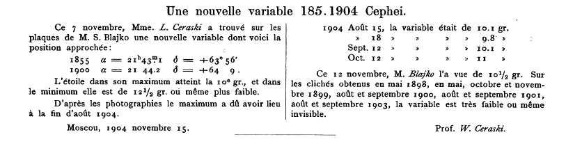 Efter en del letande lyckades jag hitta upptäcktsartikeln för RT Cep, se nedan (från Astronomische Nachrichten).