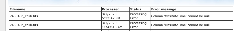 Det verkar vara något skumt med den kalibrerade bildens fil vad gäller headerns information om tidpunkt för observation. Detta tycks medföra att filen inte kommer upp i Vphot: