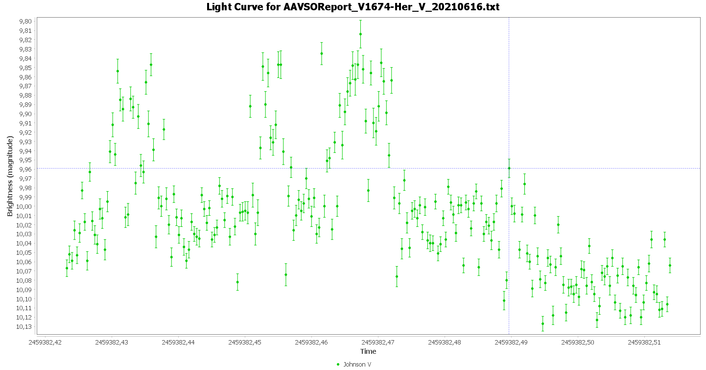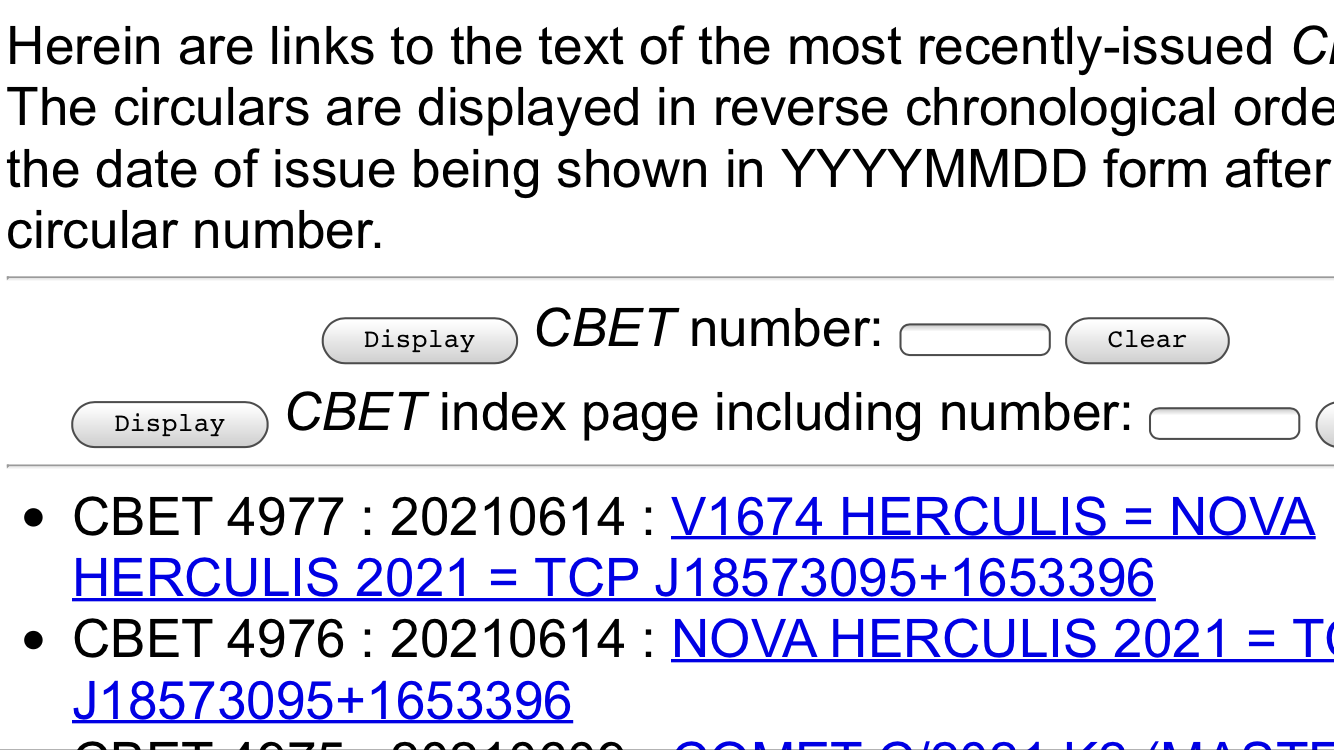 Jag har nu bytt namn på alla obsar inlagda med namnet "N Her 2021" till det nya "V1674 Her". Och också lagt in uppgifterna från VSX i SVO och tagit bort namnet "N Her 2021". Så alla obsar av nya novan i Herkules registreras alltså nu på V1674 Her.Hans Bengtsson wrote:N Her 2021 har nu fått det slutliga namnet V1674 Her.