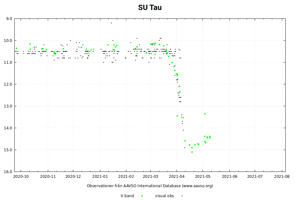SU Tauri gick ända ner till mag 15 i sitt senaste minimum i våras (april). När de senaste observationerna trillade in fanns stjärnan antagligen redan i återhämtningsfas. Det blir intressant att följa den denna höst-vinter!