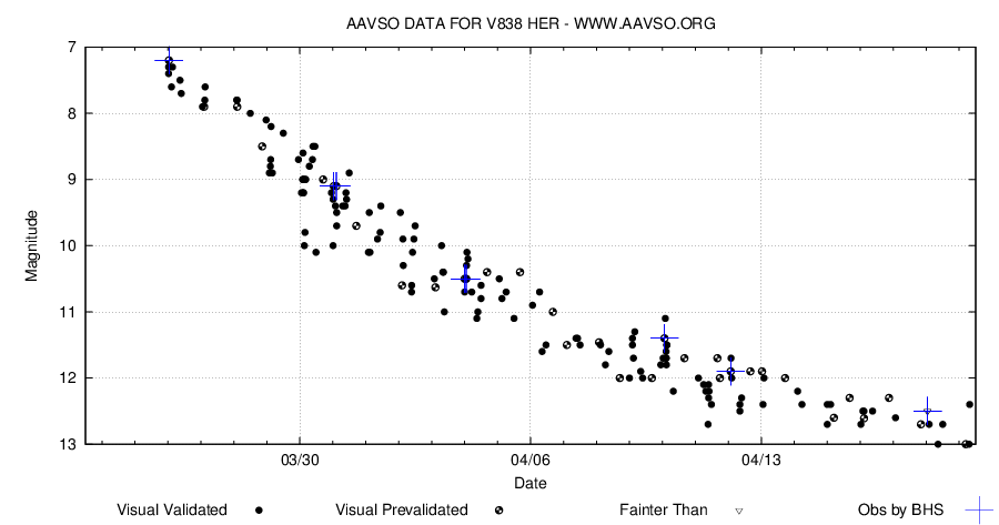 Jag fick höra talas om upptäckten redan på kvällen samma dygn, gjorde kartor och kollade magnituder för jfr-stjärnor. När området väl hade stigit upp över den göteborgska horisonten framåt småtimmarna, då var det inte alls någon stjärna av magnitud 5 som jag fick se, utan en stjärna av magnitud 7.2. Märkligt, tyckte jag. Det visade sig att denna nova, som så småningom fick namnet V0838 Her, var alldeles extremt snabb i sitt avtagande - på 20 timmar hade den bleknat med 2 magnituder. Och avtagandet fortsatte sedan att ske väldigt snabbt.