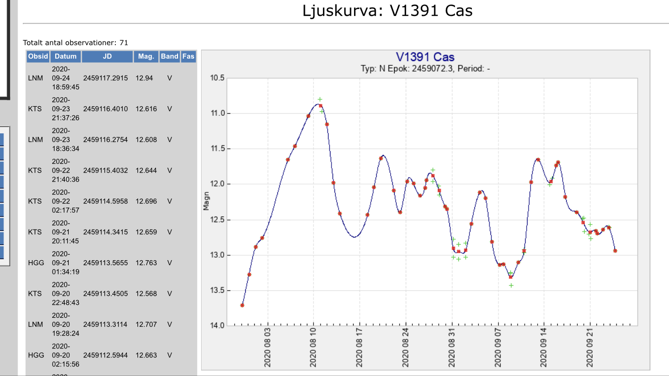 De senaste 3 dagarnas SDST resultat för nova V1391 Cas är nu inne i SVO. På nytt ökar novan en aning i ljusstyrka.