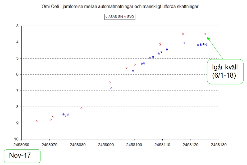 Gjorde ett nedslag på nyliga omi-ceti-data (jag misstänker för övrigt att maxet är passerat (tror röda lodräta linjerna i SVO-diagrammen ligger lite till höger om maxet)). Tycker ASAS-SN prickat rätt ok men inte HELT rätt. Har kollat aavso-data också och de skattar den ljusare än vad ASAS-SN gjorde inatt.