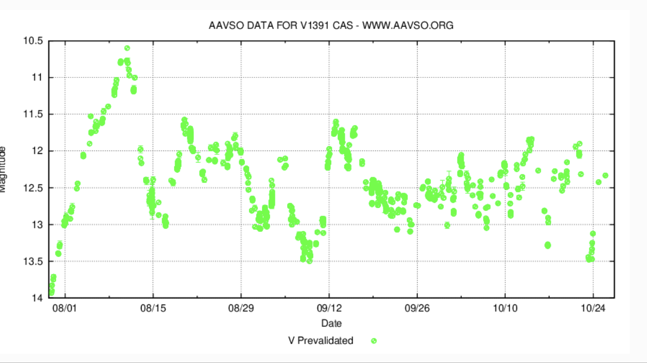V1391 Cas, 13.25 12.42, den hade en dipp och var nere på 13.5, men har sedan återgått till runt 12.4