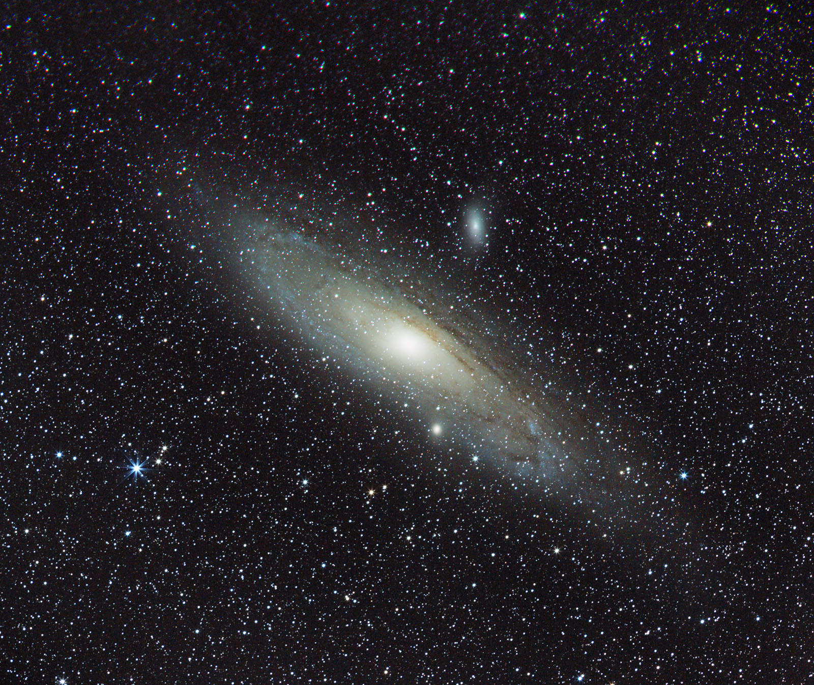 Vad gäller distorsionen på dina stjärnor så tycker jag den är mycket måttlig. Som du beskriver beror den antagligen dels på polinställningen och kanske ännu mer på att objektivet har begränsad kantskärpa vid bländare 4. Snygg bild på Andromedagalaxen förresten!
