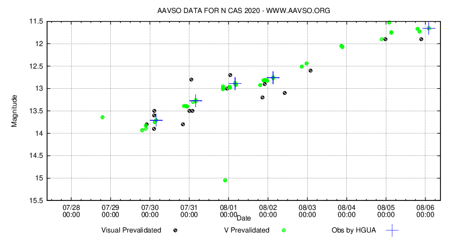 N Cas 2020 fortsätter att ljusna, den har nu nått visuell magnitud 11.2. Det känns som om vi har att göra med en ganska ovanlig sorts nova, inte en som omedelbart efter utbrottet når max och direkt börjar avta, utan istället en nova med långsam ökning mot max.