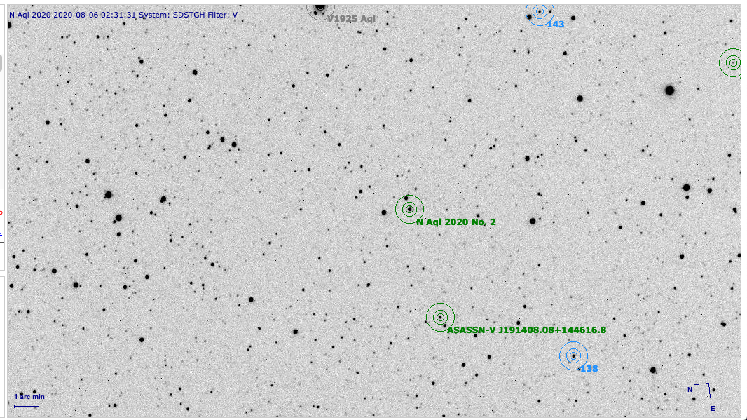 Novan i Aquila (AT 2020qpq) är också i stort behov av mätningar. Förutom SDST-mätningen i morse har AAVSO i nuläget bara en enda mätning i arkivet! SDST-obsen tyder på att novan snabbt har blivit mycket ljusare, ett synnerligen intressant resultat (Edit: se dock ett inlägg lite längre ner i tråden). Denna nova är försvagad av interstellärt stoft, och därför rödare än vad den annars skulle ha varit. Man kan tänka sig att V-mätningar blir en smula osäkra eftersom filtrets exakta egenskaper kan spela roll.
