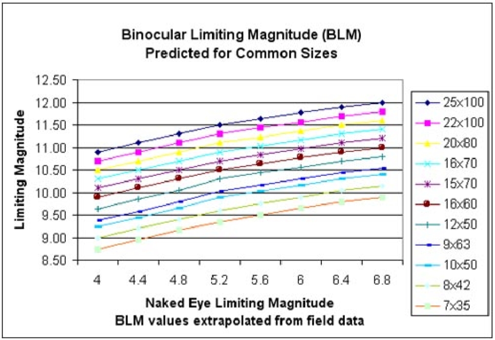 Intressant diagram Katarina. Jag tycker den stämmer väldigt bra för min 25x100. Jag brukar kunna se stjärnor 4.5 till 5 från min balkong med blotta ögat om det är bra förhållanden och ingen måne framme, och med kikaren kan jag komma ner en bit under 11. Med min 10x50 tycker jag inte det stämmer lika bra. Enligt diagrammet skulle jag nå 9.5 till 10 men tror jag får dra av en magnitud på de siffrorna. Skillnaden är nog att den stora kikaren är på ett stativ och den mindre håller jag i handen. Diagrammet kanske är gjort med förutsättningen att alla kikare är på stativ?