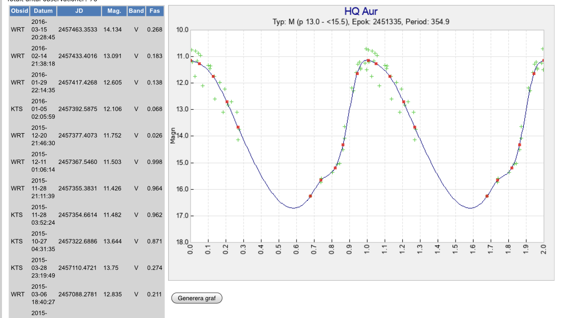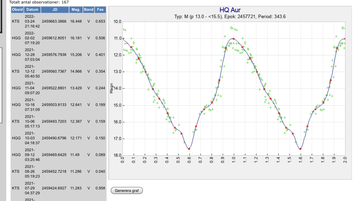 Hans, HQ Aur verkar som du skriver ha en varierande period. Testade beräkna perioden från DASH-datan som täcker perioden 1897-1989, dock med stora gap. Där blir medelperioden 349.5. Från alla obsar i SVO blev perioden 347.0. Elementen i SVO är en sammanvägning av obsar från SVO, ASAS-SN och NSVS. Där blev perioden nu en aning kortare än tidigare, 354.5 mot 354.9, som har justerats i SVO. Jag tycker alltid det är svårt att avgöra hur lång tid som är lämpligt som underlag för en periodberäkning. Med för lång tid smetas förändringar i perioden ut, med för kort tid kan tillfälliga slumpvisa variationer få för stort genomslag.