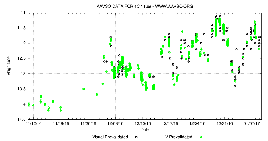 Nedan ses den aktuella visuella ljuskurvan för 4C 11.69 (AAVSO).