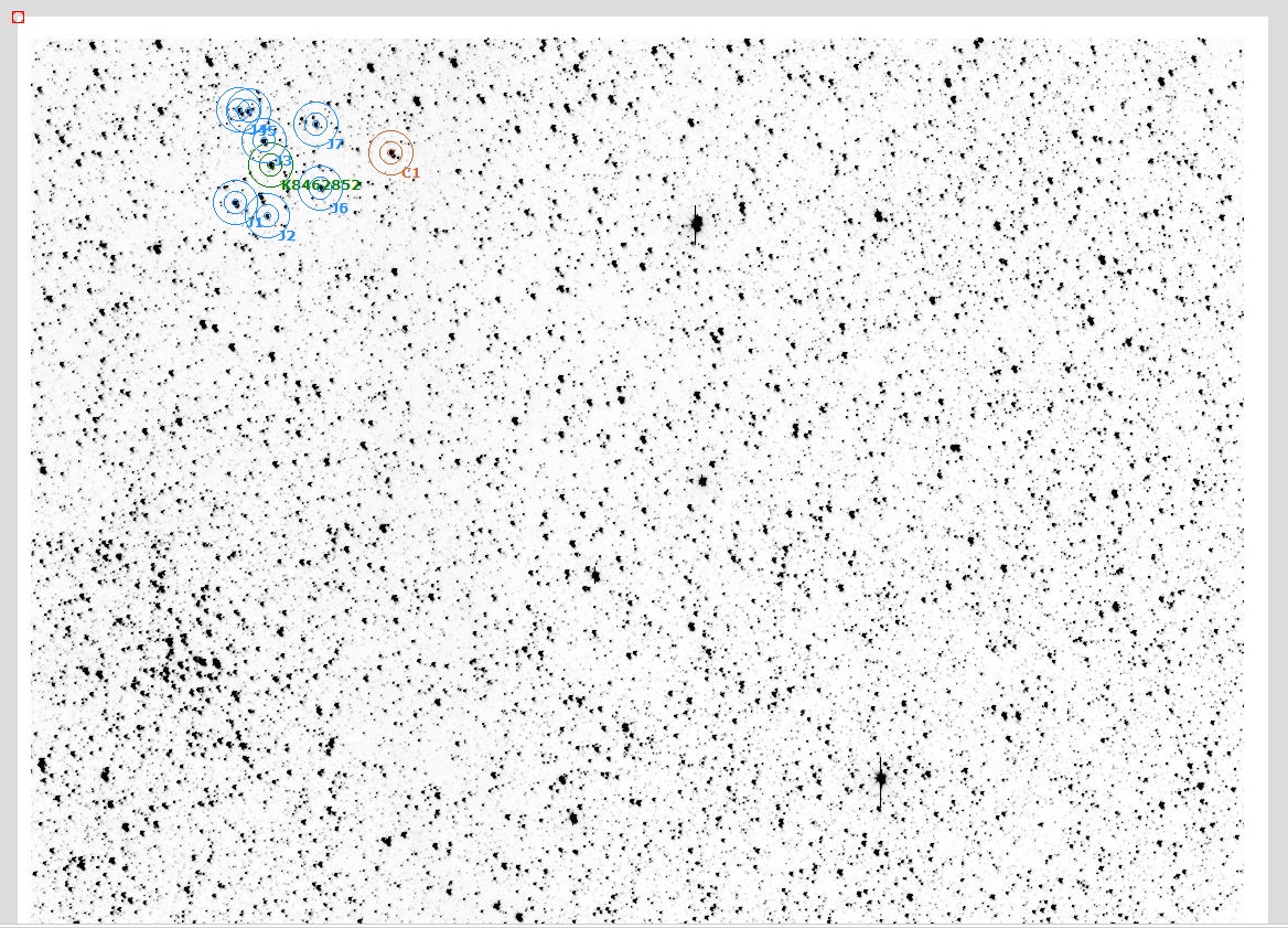 Efter att ha extraherat rätt kanal från de 53 FFI-bilderna laddade jag upp dem till AAVSO:s VPHOT. Jag använde samma jämförstjärnor som i artikeln. Här är en närbild på Tabbys stjärna med jämförstjärnor från en FFI.