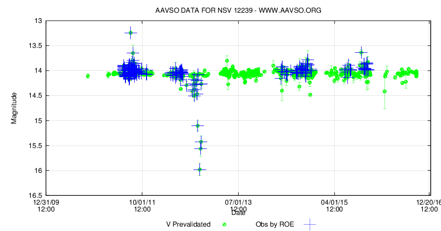 NSV 12239 är en stjärna som jag inte hade hörde talas om tidigare (eventuellt: glömt bort). Det finns förvånansvärt många V-observationer av den i AAVSO:s databas. De allra flesta mätningarna ligger samlade vid max-magnitud ... men så har vi också den märkliga månaden oktober 2012. Enligt James Roe hamnade stjärnan då i ett djupt minimum. Synd att det inte finns oberoende observationer av minimet.